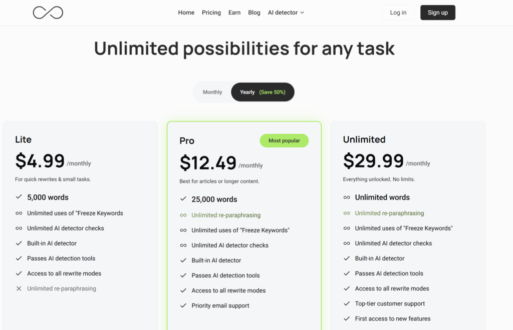 GPTInf offers different pricing options based on how much text you need to rewrite. You can pay for short-term or longer-term access.